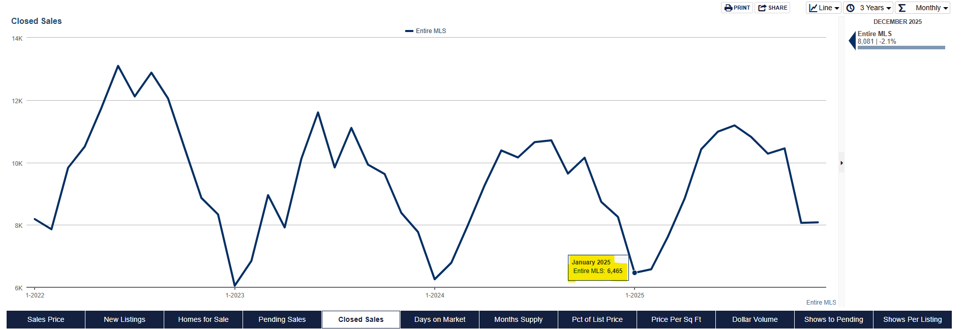 Take a look at the chart above, that is closed sales for every month. Every year, the market hits a low in closed sales in January and in February it recovers, so this is the time to be shopping around for a good deal in real estate before everyone jumps back into the market. I think if you are looking for real estate now, its much easier to get a deal than it was in the years past. Make sure you're working with an agent who will help you find and negotiate those good deals.
